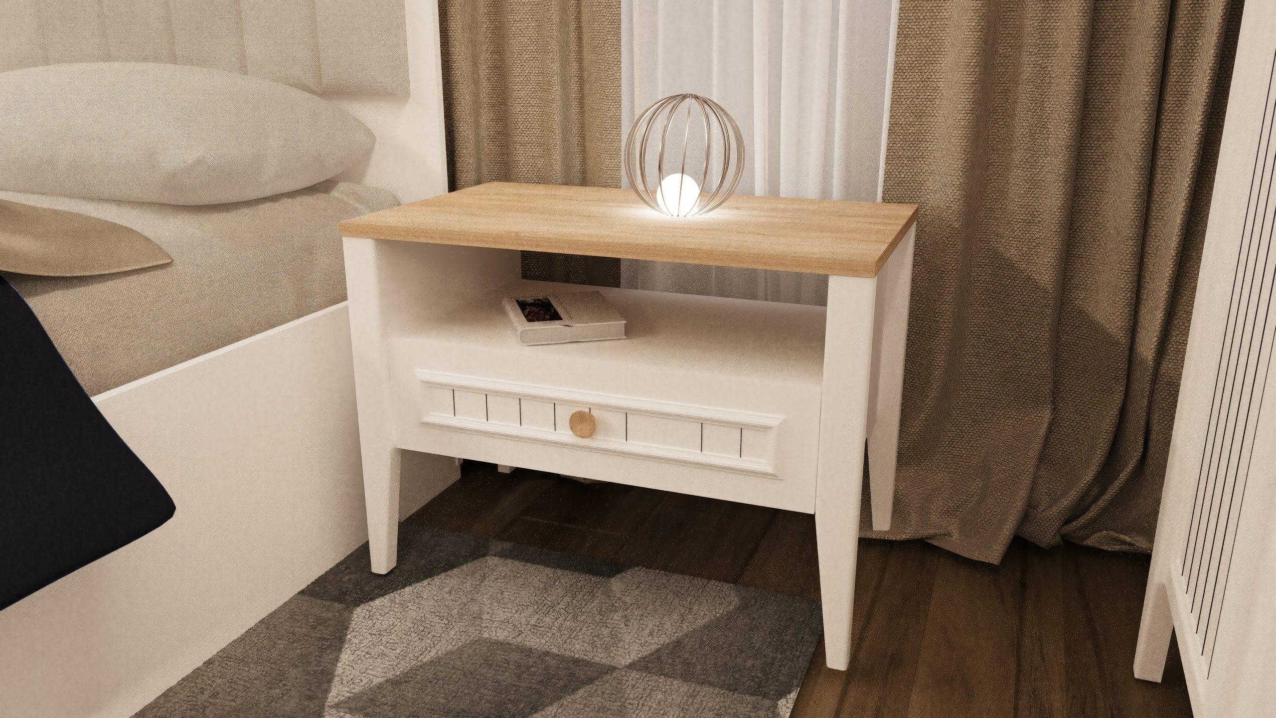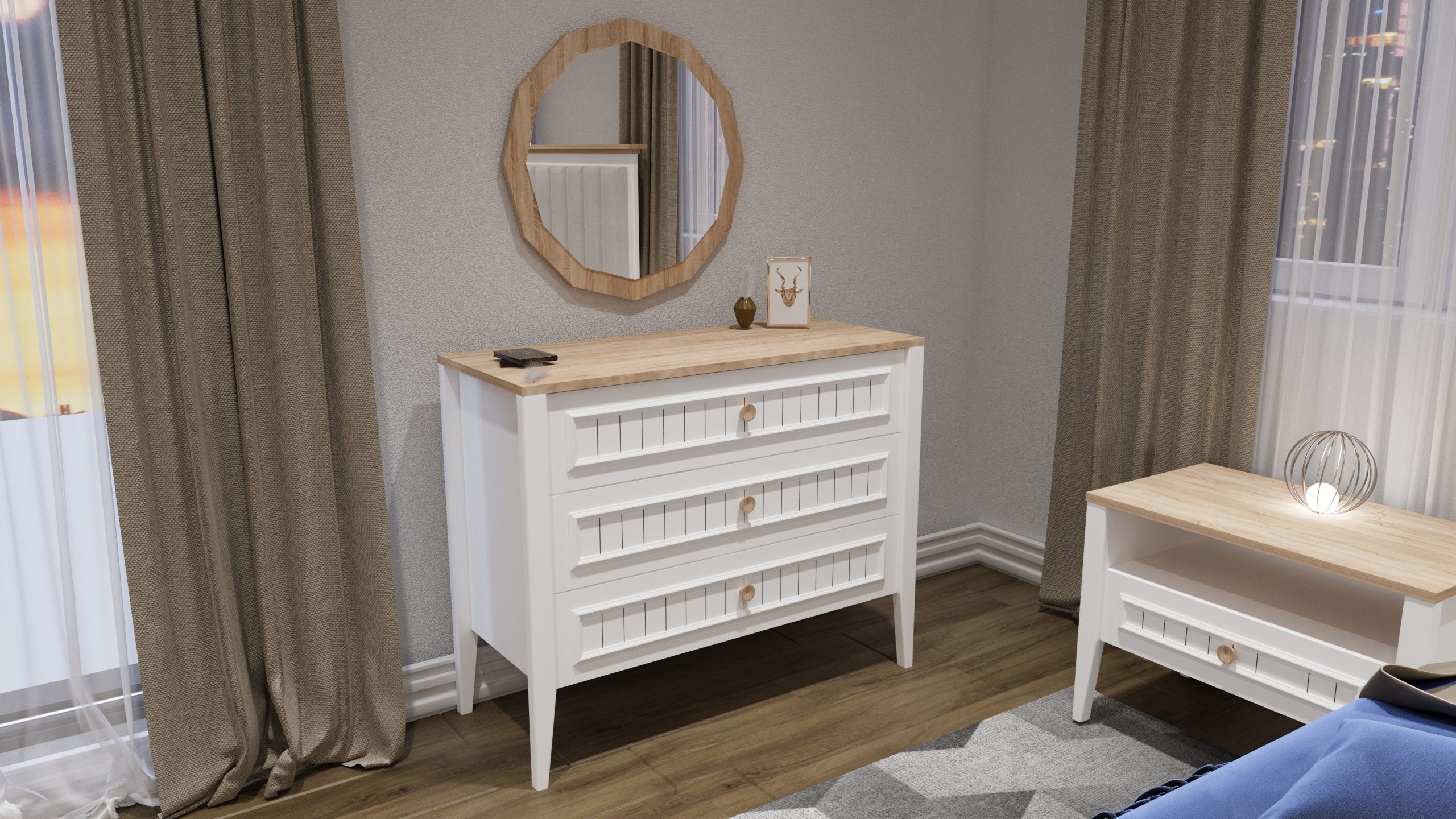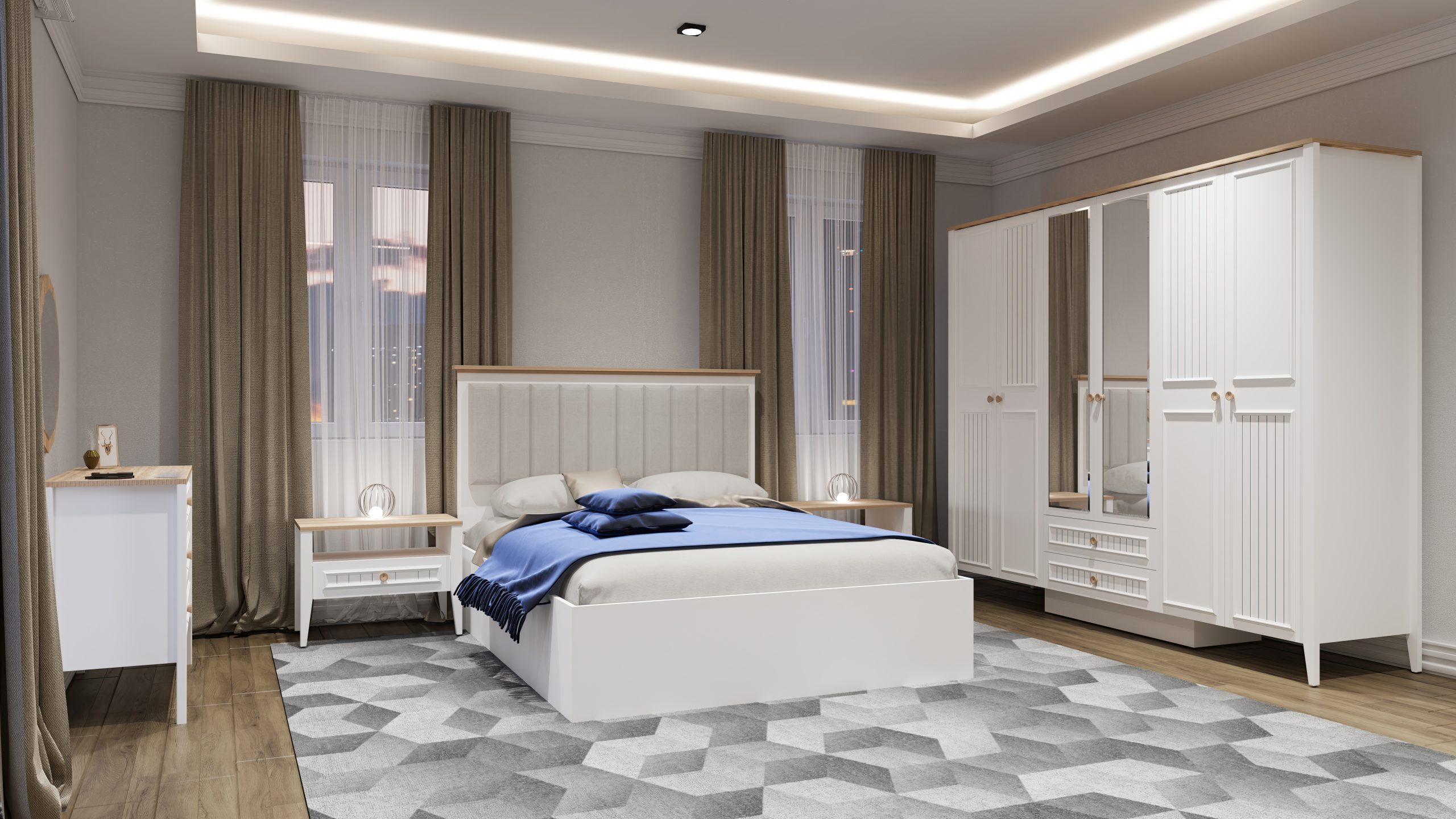 - 1 Adet Gardrop,1 Adet Karyola,2 Adet Komodin,1 Adet Şifonyerden Oluşmaktadır