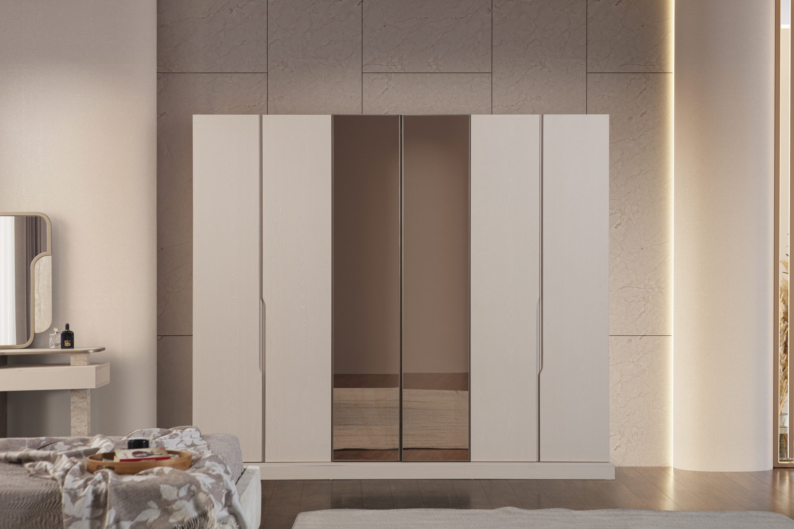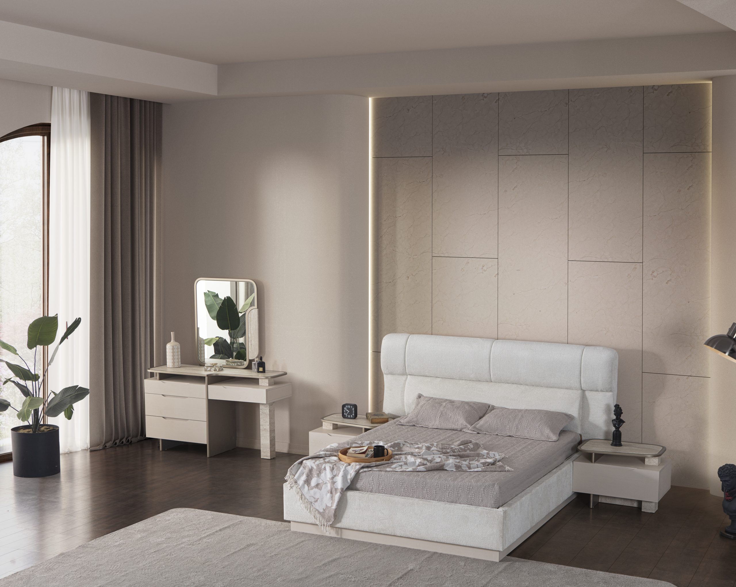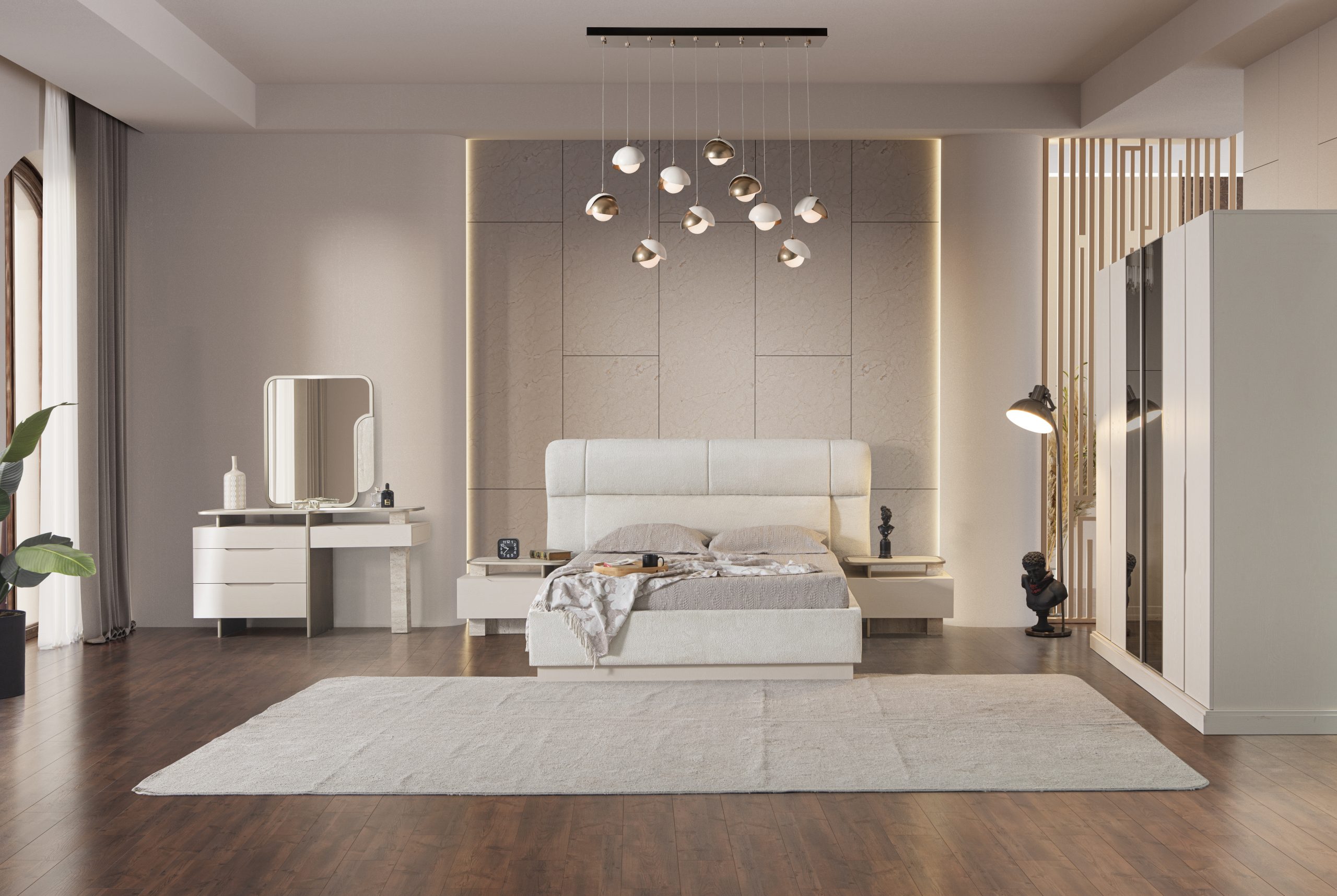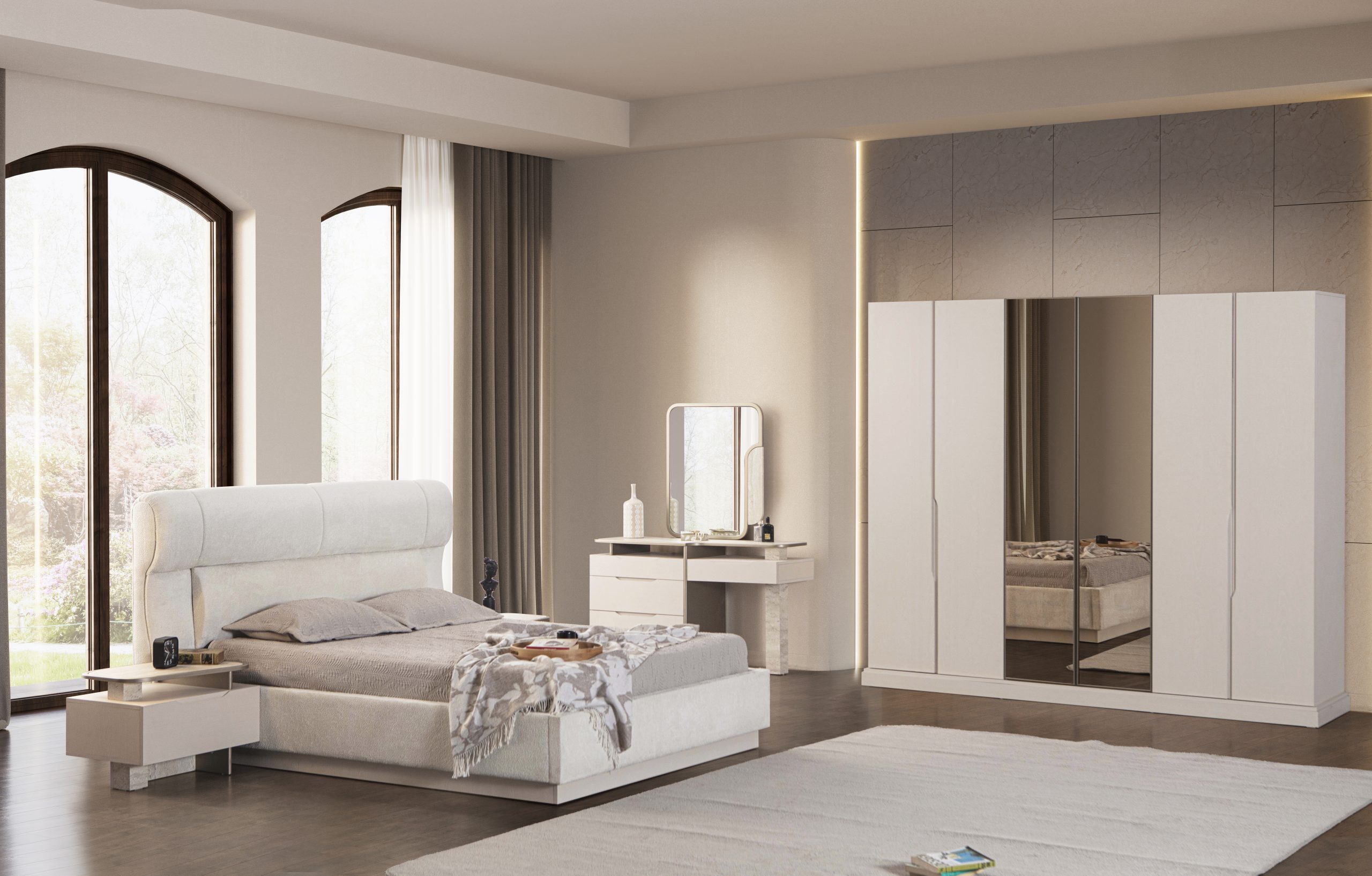 • 1 Adet Gardrop,1 Adet Karyola,2 Adet Komodin,1 Adet Şifonyerden Oluşmaktadır